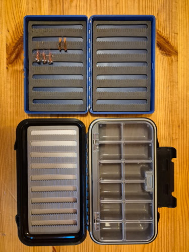 Efter en madpakke- og brunsviger-pause dukkede seniormedlem (og juniorernes generøse ven) Claus Thomsen op med milde gaver. En våd- og en tørflueboks til hver af de 3 deltagere. Mange tak! – Vi nåede kun ét mønster mere, nemlig min storfanger-flue til Trend Å, to eksemplarer af First Choice med fronthackle, men Viktor var lærenem, så han, brødrene og forhåbentlig flere er klar til komme videre med fluebindingen – og få flere topfangere i de nye bokse - når vi fortsætter med fluebinding på 3 klubaftener sidst på vinteren.